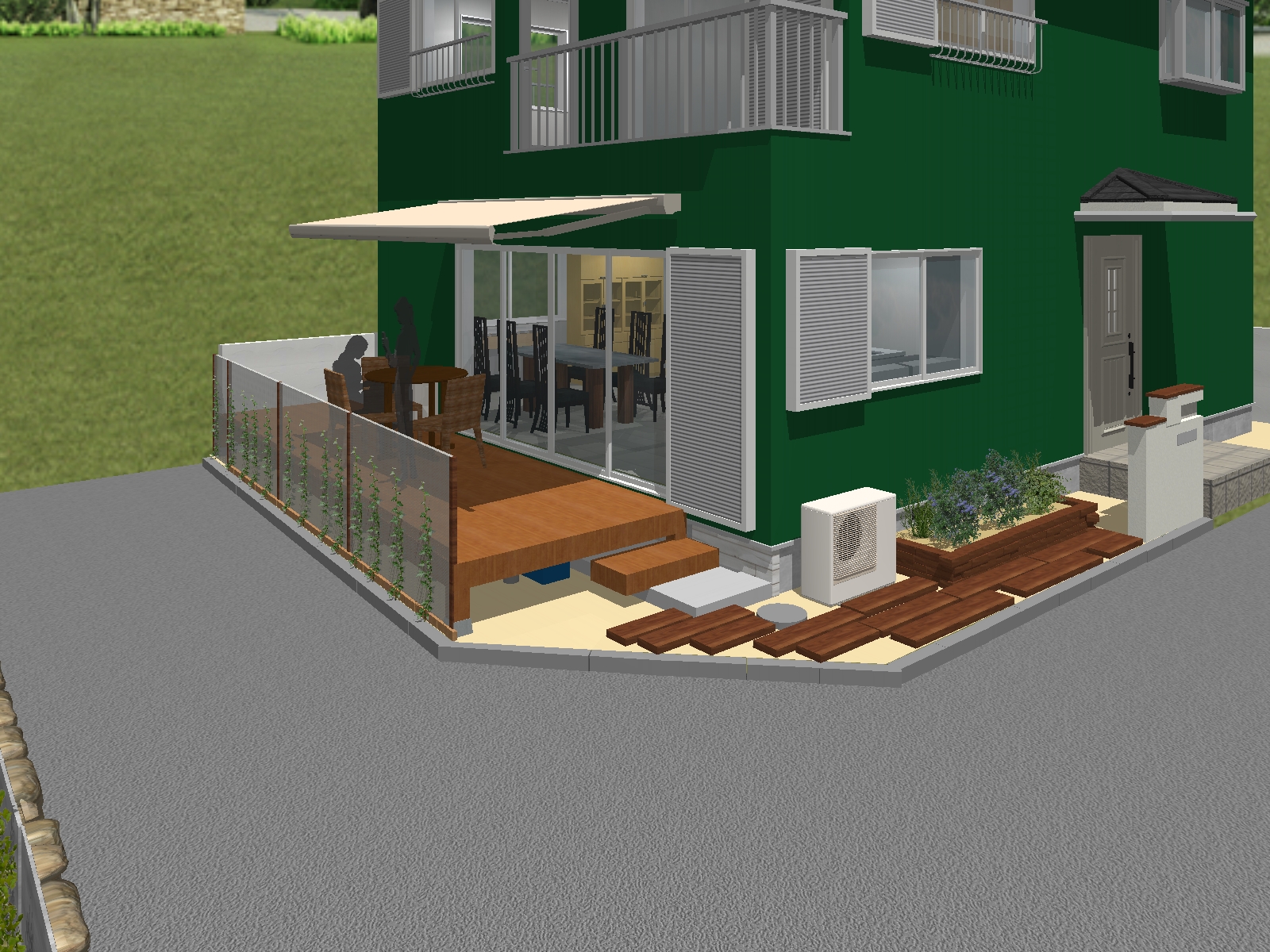 外壁が濃いめのグリーンなので、デッキは少し明るめの色をセレクト。